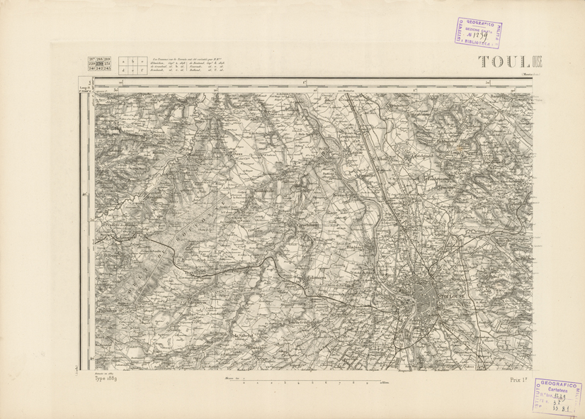 "Paris. - Service Géograèhique de l'Armée, 1889. Ebbe origine dall'Edizione zincografica in quarti di foglio, stabilita fino dal 1879, per la Carta detta de "L'etat-Major". Infatti non rispondendo più il sistema della riproduzione zincografica alle esigenze che la revisione dei fogli imponeva per un inevitabile logoramento dei rami originali, fu proposta dapprima la correzione degli zinchi, ma questo, importando un lavoro lungo e gravoso, si adottò il procedimento galvanico. I rami galvanici ottenuti e corretti secondo questo sistema presero il nome di "édition type 1889". Allo scopo di facilitare l'incisione fu adoperata la suddivisione in quarti di foglio come per l'edizione zincografica. la revisione dei fogli di questo tipo nnn fu iniziata che nel 1893. Dal catalogo del S.G.A. risultano mancanti a questa edizione i dipartimenti della "Moselle", del "Bas-Rhin" e del "Haut-Rhin" per le quali non esiste che una edizione in fogli interi aggiornata nel 1901."