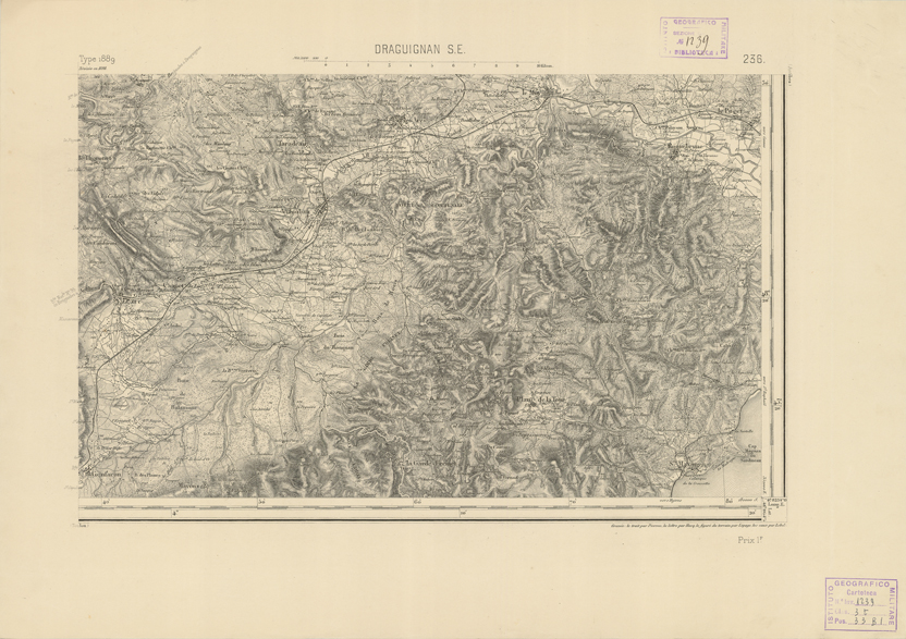 "Paris. - Service Géograèhique de l'Armée, 1889. Ebbe origine dall'Edizione zincografica in quarti di foglio, stabilita fino dal 1879, per la Carta detta de "L'etat-Major". Infatti non rispondendo più il sistema della riproduzione zincografica alle esigenze che la revisione dei fogli imponeva per un inevitabile logoramento dei rami originali, fu proposta dapprima la correzione degli zinchi, ma questo, importando un lavoro lungo e gravoso, si adottò il procedimento galvanico. I rami galvanici ottenuti e corretti secondo questo sistema presero il nome di "édition type 1889". Allo scopo di facilitare l'incisione fu adoperata la suddivisione in quarti di foglio come per l'edizione zincografica. la revisione dei fogli di questo tipo nnn fu iniziata che nel 1893. Dal catalogo del S.G.A. risultano mancanti a questa edizione i dipartimenti della "Moselle", del "Bas-Rhin" e del "Haut-Rhin" per le quali non esiste che una edizione in fogli interi aggiornata nel 1901."