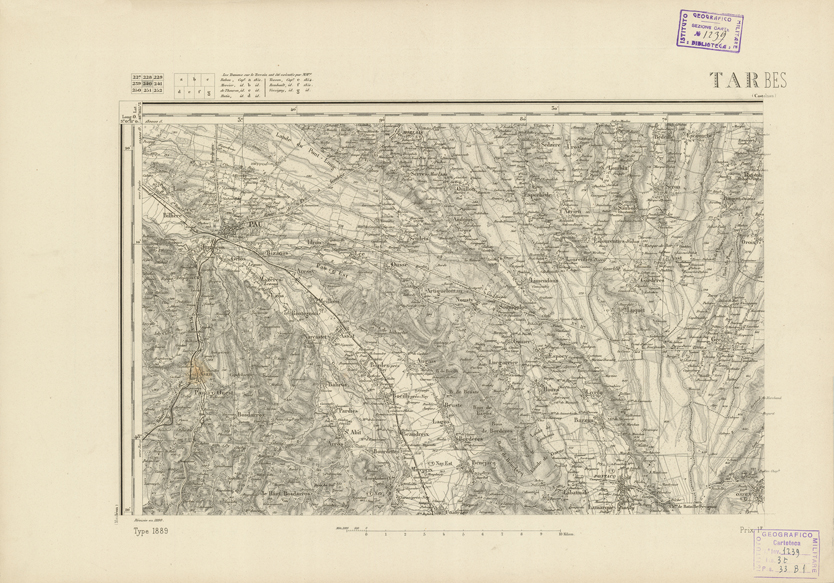 "Paris. - Service Géograèhique de l'Armée, 1889. Ebbe origine dall'Edizione zincografica in quarti di foglio, stabilita fino dal 1879, per la Carta detta de "L'etat-Major". Infatti non rispondendo più il sistema della riproduzione zincografica alle esigenze che la revisione dei fogli imponeva per un inevitabile logoramento dei rami originali, fu proposta dapprima la correzione degli zinchi, ma questo, importando un lavoro lungo e gravoso, si adottò il procedimento galvanico. I rami galvanici ottenuti e corretti secondo questo sistema presero il nome di "édition type 1889". Allo scopo di facilitare l'incisione fu adoperata la suddivisione in quarti di foglio come per l'edizione zincografica. la revisione dei fogli di questo tipo nnn fu iniziata che nel 1893. Dal catalogo del S.G.A. risultano mancanti a questa edizione i dipartimenti della "Moselle", del "Bas-Rhin" e del "Haut-Rhin" per le quali non esiste che una edizione in fogli interi aggiornata nel 1901."