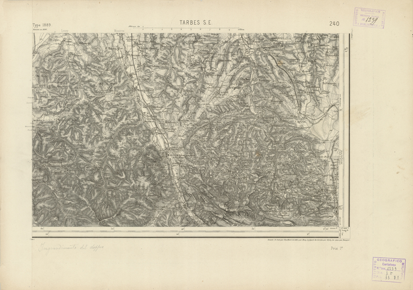 "Paris. - Service Géograèhique de l'Armée, 1889. Ebbe origine dall'Edizione zincografica in quarti di foglio, stabilita fino dal 1879, per la Carta detta de "L'etat-Major". Infatti non rispondendo più il sistema della riproduzione zincografica alle esigenze che la revisione dei fogli imponeva per un inevitabile logoramento dei rami originali, fu proposta dapprima la correzione degli zinchi, ma questo, importando un lavoro lungo e gravoso, si adottò il procedimento galvanico. I rami galvanici ottenuti e corretti secondo questo sistema presero il nome di "édition type 1889". Allo scopo di facilitare l'incisione fu adoperata la suddivisione in quarti di foglio come per l'edizione zincografica. la revisione dei fogli di questo tipo nnn fu iniziata che nel 1893. Dal catalogo del S.G.A. risultano mancanti a questa edizione i dipartimenti della "Moselle", del "Bas-Rhin" e del "Haut-Rhin" per le quali non esiste che una edizione in fogli interi aggiornata nel 1901."