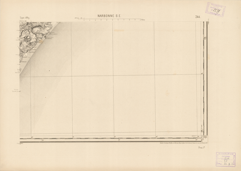 "Paris. - Service Géograèhique de l'Armée, 1889. Ebbe origine dall'Edizione zincografica in quarti di foglio, stabilita fino dal 1879, per la Carta detta de "L'etat-Major". Infatti non rispondendo più il sistema della riproduzione zincografica alle esigenze che la revisione dei fogli imponeva per un inevitabile logoramento dei rami originali, fu proposta dapprima la correzione degli zinchi, ma questo, importando un lavoro lungo e gravoso, si adottò il procedimento galvanico. I rami galvanici ottenuti e corretti secondo questo sistema presero il nome di "édition type 1889". Allo scopo di facilitare l'incisione fu adoperata la suddivisione in quarti di foglio come per l'edizione zincografica. la revisione dei fogli di questo tipo nnn fu iniziata che nel 1893. Dal catalogo del S.G.A. risultano mancanti a questa edizione i dipartimenti della "Moselle", del "Bas-Rhin" e del "Haut-Rhin" per le quali non esiste che una edizione in fogli interi aggiornata nel 1901."