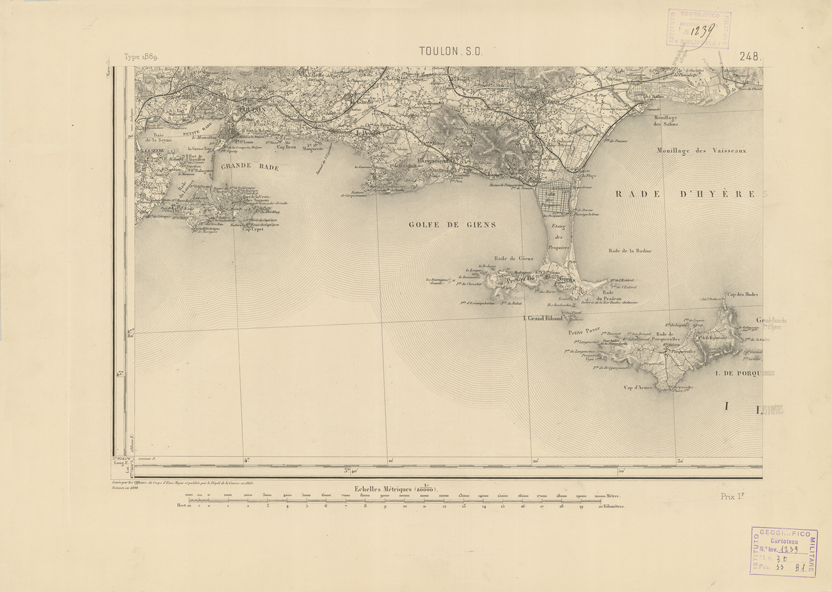 "Paris. - Service Géograèhique de l'Armée, 1889. Ebbe origine dall'Edizione zincografica in quarti di foglio, stabilita fino dal 1879, per la Carta detta de "L'etat-Major". Infatti non rispondendo più il sistema della riproduzione zincografica alle esigenze che la revisione dei fogli imponeva per un inevitabile logoramento dei rami originali, fu proposta dapprima la correzione degli zinchi, ma questo, importando un lavoro lungo e gravoso, si adottò il procedimento galvanico. I rami galvanici ottenuti e corretti secondo questo sistema presero il nome di "édition type 1889". Allo scopo di facilitare l'incisione fu adoperata la suddivisione in quarti di foglio come per l'edizione zincografica. la revisione dei fogli di questo tipo nnn fu iniziata che nel 1893. Dal catalogo del S.G.A. risultano mancanti a questa edizione i dipartimenti della "Moselle", del "Bas-Rhin" e del "Haut-Rhin" per le quali non esiste che una edizione in fogli interi aggiornata nel 1901."