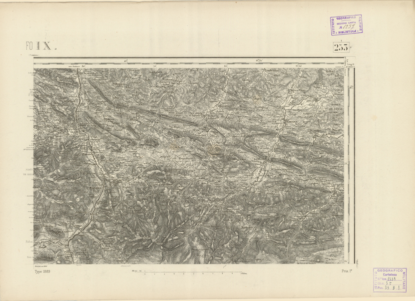"Paris. - Service Géograèhique de l'Armée, 1889. Ebbe origine dall'Edizione zincografica in quarti di foglio, stabilita fino dal 1879, per la Carta detta de "L'etat-Major". Infatti non rispondendo più il sistema della riproduzione zincografica alle esigenze che la revisione dei fogli imponeva per un inevitabile logoramento dei rami originali, fu proposta dapprima la correzione degli zinchi, ma questo, importando un lavoro lungo e gravoso, si adottò il procedimento galvanico. I rami galvanici ottenuti e corretti secondo questo sistema presero il nome di "édition type 1889". Allo scopo di facilitare l'incisione fu adoperata la suddivisione in quarti di foglio come per l'edizione zincografica. la revisione dei fogli di questo tipo nnn fu iniziata che nel 1893. Dal catalogo del S.G.A. risultano mancanti a questa edizione i dipartimenti della "Moselle", del "Bas-Rhin" e del "Haut-Rhin" per le quali non esiste che una edizione in fogli interi aggiornata nel 1901."