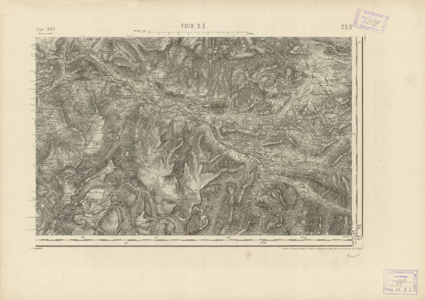 "Paris. - Service Géograèhique de l'Armée, 1889. Ebbe origine dall'Edizione zincografica in quarti di foglio, stabilita fino dal 1879, per la Carta detta de "L'etat-Major". Infatti non rispondendo più il sistema della riproduzione zincografica alle esigenze che la revisione dei fogli imponeva per un inevitabile logoramento dei rami originali, fu proposta dapprima la correzione degli zinchi, ma questo, importando un lavoro lungo e gravoso, si adottò il procedimento galvanico. I rami galvanici ottenuti e corretti secondo questo sistema presero il nome di "édition type 1889". Allo scopo di facilitare l'incisione fu adoperata la suddivisione in quarti di foglio come per l'edizione zincografica. la revisione dei fogli di questo tipo nnn fu iniziata che nel 1893. Dal catalogo del S.G.A. risultano mancanti a questa edizione i dipartimenti della "Moselle", del "Bas-Rhin" e del "Haut-Rhin" per le quali non esiste che una edizione in fogli interi aggiornata nel 1901."