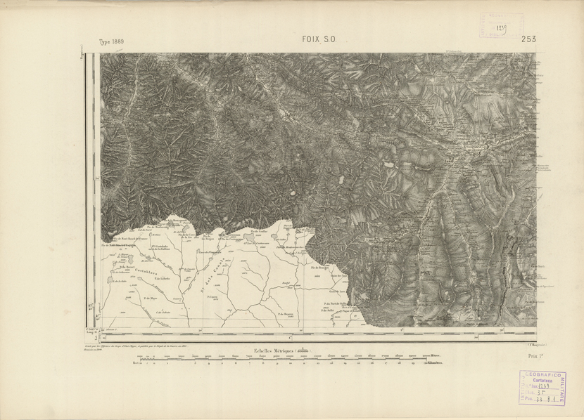 "Paris. - Service Géograèhique de l'Armée, 1889. Ebbe origine dall'Edizione zincografica in quarti di foglio, stabilita fino dal 1879, per la Carta detta de "L'etat-Major". Infatti non rispondendo più il sistema della riproduzione zincografica alle esigenze che la revisione dei fogli imponeva per un inevitabile logoramento dei rami originali, fu proposta dapprima la correzione degli zinchi, ma questo, importando un lavoro lungo e gravoso, si adottò il procedimento galvanico. I rami galvanici ottenuti e corretti secondo questo sistema presero il nome di "édition type 1889". Allo scopo di facilitare l'incisione fu adoperata la suddivisione in quarti di foglio come per l'edizione zincografica. la revisione dei fogli di questo tipo nnn fu iniziata che nel 1893. Dal catalogo del S.G.A. risultano mancanti a questa edizione i dipartimenti della "Moselle", del "Bas-Rhin" e del "Haut-Rhin" per le quali non esiste che una edizione in fogli interi aggiornata nel 1901."