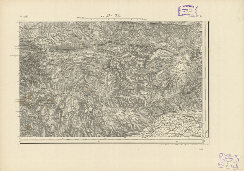 "Paris. - Service Géograèhique de l'Armée, 1889. Ebbe origine dall'Edizione zincografica in quarti di foglio, stabilita fino dal 1879, per la Carta detta de "L'etat-Major". Infatti non rispondendo più il sistema della riproduzione zincografica alle esigenze che la revisione dei fogli imponeva per un inevitabile logoramento dei rami originali, fu proposta dapprima la correzione degli zinchi, ma questo, importando un lavoro lungo e gravoso, si adottò il procedimento galvanico. I rami galvanici ottenuti e corretti secondo questo sistema presero il nome di "édition type 1889". Allo scopo di facilitare l'incisione fu adoperata la suddivisione in quarti di foglio come per l'edizione zincografica. la revisione dei fogli di questo tipo nnn fu iniziata che nel 1893. Dal catalogo del S.G.A. risultano mancanti a questa edizione i dipartimenti della "Moselle", del "Bas-Rhin" e del "Haut-Rhin" per le quali non esiste che una edizione in fogli interi aggiornata nel 1901."