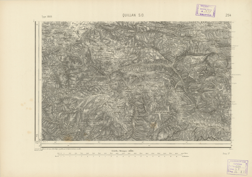 "Paris. - Service Géograèhique de l'Armée, 1889. Ebbe origine dall'Edizione zincografica in quarti di foglio, stabilita fino dal 1879, per la Carta detta de "L'etat-Major". Infatti non rispondendo più il sistema della riproduzione zincografica alle esigenze che la revisione dei fogli imponeva per un inevitabile logoramento dei rami originali, fu proposta dapprima la correzione degli zinchi, ma questo, importando un lavoro lungo e gravoso, si adottò il procedimento galvanico. I rami galvanici ottenuti e corretti secondo questo sistema presero il nome di "édition type 1889". Allo scopo di facilitare l'incisione fu adoperata la suddivisione in quarti di foglio come per l'edizione zincografica. la revisione dei fogli di questo tipo nnn fu iniziata che nel 1893. Dal catalogo del S.G.A. risultano mancanti a questa edizione i dipartimenti della "Moselle", del "Bas-Rhin" e del "Haut-Rhin" per le quali non esiste che una edizione in fogli interi aggiornata nel 1901."