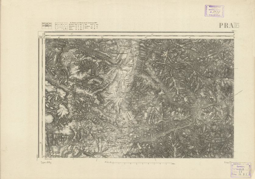 "Paris. - Service Géograèhique de l'Armée, 1889. Ebbe origine dall'Edizione zincografica in quarti di foglio, stabilita fino dal 1879, per la Carta detta de "L'etat-Major". Infatti non rispondendo più il sistema della riproduzione zincografica alle esigenze che la revisione dei fogli imponeva per un inevitabile logoramento dei rami originali, fu proposta dapprima la correzione degli zinchi, ma questo, importando un lavoro lungo e gravoso, si adottò il procedimento galvanico. I rami galvanici ottenuti e corretti secondo questo sistema presero il nome di "édition type 1889". Allo scopo di facilitare l'incisione fu adoperata la suddivisione in quarti di foglio come per l'edizione zincografica. la revisione dei fogli di questo tipo nnn fu iniziata che nel 1893. Dal catalogo del S.G.A. risultano mancanti a questa edizione i dipartimenti della "Moselle", del "Bas-Rhin" e del "Haut-Rhin" per le quali non esiste che una edizione in fogli interi aggiornata nel 1901."