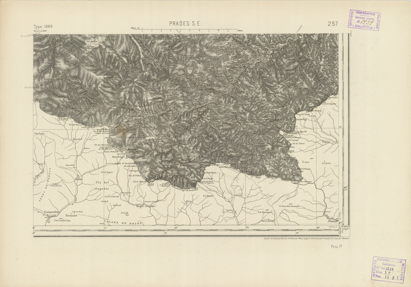 "Paris. - Service Géograèhique de l'Armée, 1889. Ebbe origine dall'Edizione zincografica in quarti di foglio, stabilita fino dal 1879, per la Carta detta de "L'etat-Major". Infatti non rispondendo più il sistema della riproduzione zincografica alle esigenze che la revisione dei fogli imponeva per un inevitabile logoramento dei rami originali, fu proposta dapprima la correzione degli zinchi, ma questo, importando un lavoro lungo e gravoso, si adottò il procedimento galvanico. I rami galvanici ottenuti e corretti secondo questo sistema presero il nome di "édition type 1889". Allo scopo di facilitare l'incisione fu adoperata la suddivisione in quarti di foglio come per l'edizione zincografica. la revisione dei fogli di questo tipo nnn fu iniziata che nel 1893. Dal catalogo del S.G.A. risultano mancanti a questa edizione i dipartimenti della "Moselle", del "Bas-Rhin" e del "Haut-Rhin" per le quali non esiste che una edizione in fogli interi aggiornata nel 1901."