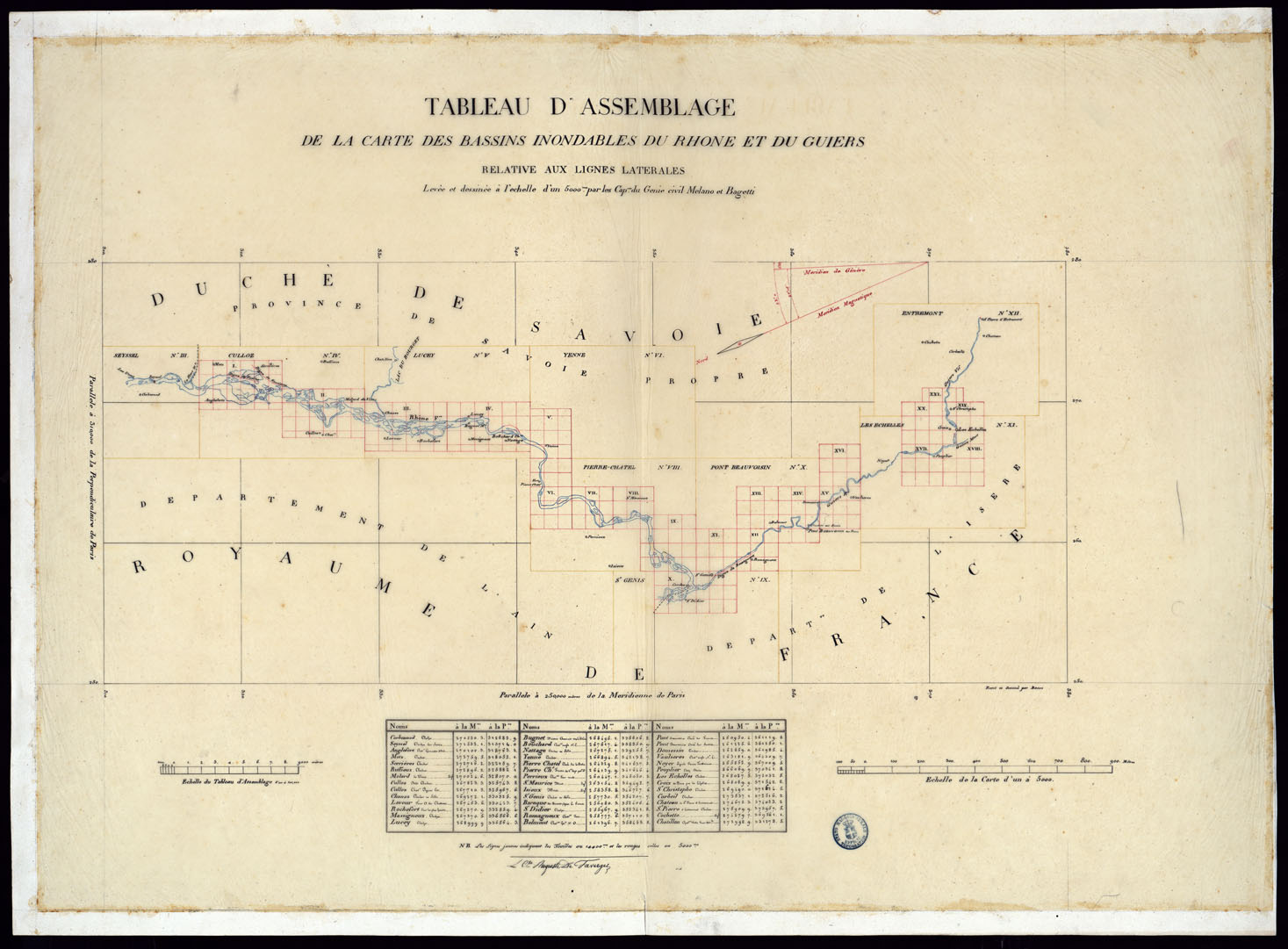 TABLEAU D'ASSEMBLAGE DE CARTE DES BASSINS INONDABLES DU RHONE ET DU GUIERS RELATIVE AUX LIGNES LATERALES LEVEE ET DESSINEE A' L'ECHELLE D'UN 5.000 ME PAR LES CAP. NES DU GENIE CIVIL MELANO ET BAGETTI - QUADRO D'UNIONE.