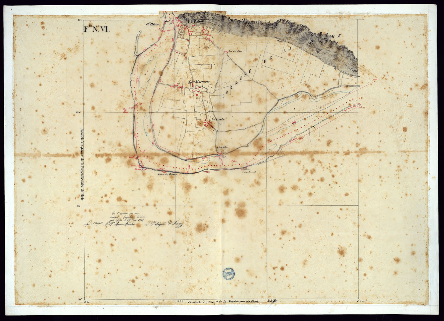 TABLEAU D'ASSEMBLAGE DE CARTE DES BASSINS INONDABLES DU RHONE ET DU GUIERS RELATIVE AUX LIGNES LATERALES LEVEE ET DESSINEE A' L'ECHELLE D'UN 5.000 ME PAR LES CAP. NES DU GENIE CIVIL MELANO ET BAGETTI - FOGLIO VI.