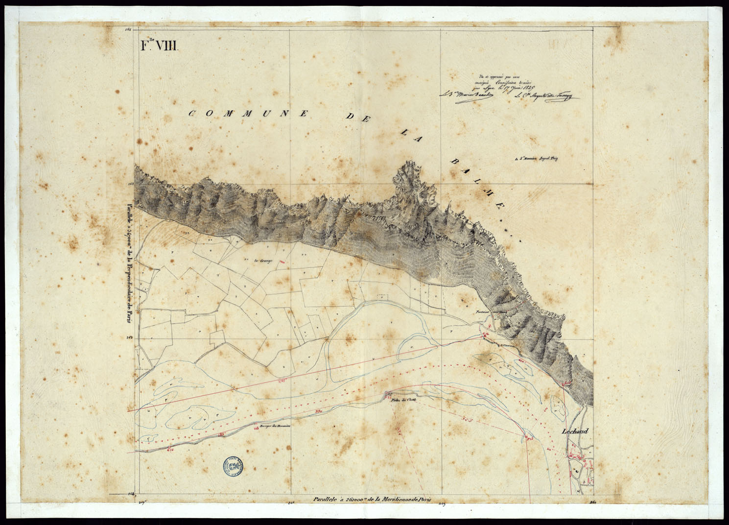 TABLEAU D'ASSEMBLAGE DE CARTE DES BASSINS INONDABLES DU RHONE ET DU GUIERS RELATIVE AUX LIGNES LATERALES LEVEE ET DESSINEE A' L'ECHELLE D'UN 5.000 ME PAR LES CAP. NES DU GENIE CIVIL MELANO ET BAGETTI - FOGLIO VIII.