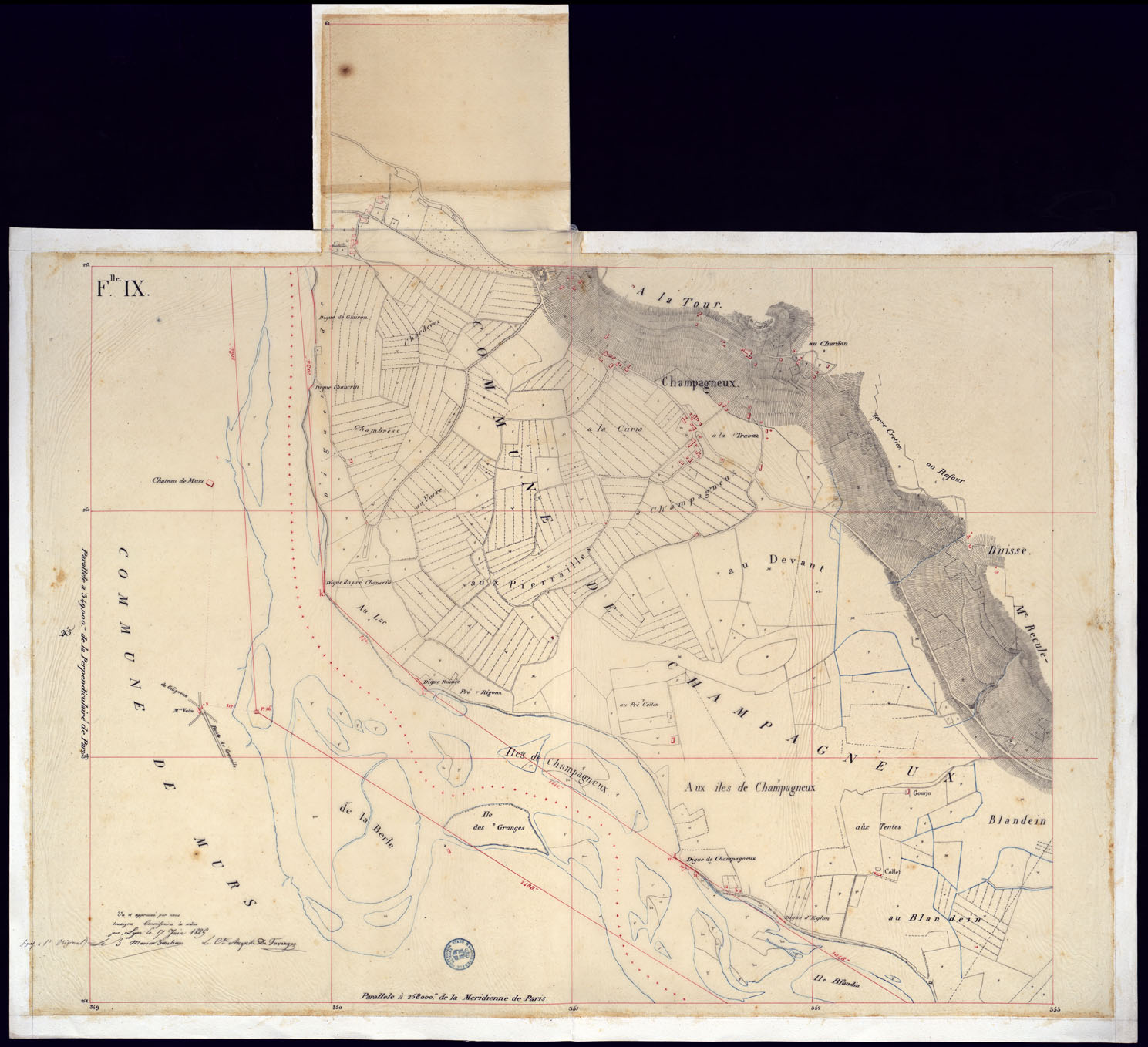 TABLEAU D'ASSEMBLAGE DE CARTE DES BASSINS INONDABLES DU RHONE ET DU GUIERS RELATIVE AUX LIGNES LATERALES LEVEE ET DESSINEE A' L'ECHELLE D'UN 5.000 ME PAR LES CAP. NES DU GENIE CIVIL MELANO ET BAGETTI - FOGLIO IX.