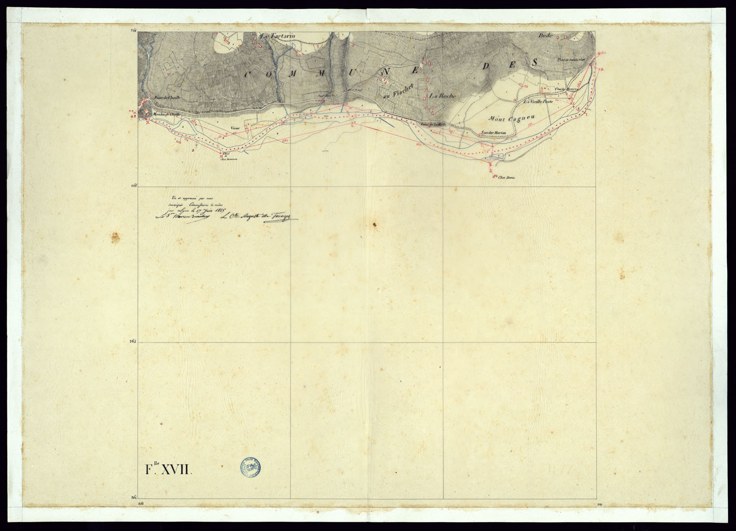 "Oltre il titolo indicato sul "Tableau d'assemblage" - Quadro d'unione - si leggono nei fogli distinti i titoli particolari: - Plan de nouvelles lignes laterales du Rhòne - Pour le Lieutenant Général commissaire du Roi pour la Demarcation des frontieres orientales du Royaume Le Colonel delegué pour la Demarcation des Limites avec les Etats de S.M. le Roy de Sardigne - Plan des nouvelles lignes laterales du Guiers . Disegno a penna su carta lucida, probabilmente copia di un disegno originale. La carta si compone di 21 fogli (dei quali i primi 4 in due parti) ed un quadro d'unione per cui complessivamente consta di 26 grandi fogli non totalmente riempiti. E' riprodotto il corso del Rodano da un punto a circa 2 km. a monte di Anglefort sino alla confluenza del Guiers ed il corso di quest'ultimo sino al Pont Saint Martin poco a monte di Les Echelles. Il disegno è in azzurro per le acque, in rosso per i fabbricati, le dighe, il confine e le misure di riferimento in nero per la rete stradale, il tratteggio orografico e le scritture. Il Quadro d'Unione alla scala di 1:100.000 porta in calce un elenco di 42 posizioni determinate per le loro coordinate rettangolari riferite alla meridiana ed alla perpendicolare di Parigi in base alle quali è tracciato il reticolato cassiniano della Carta. Documento interessante per la topografia storica dei fiumi rappresentati."