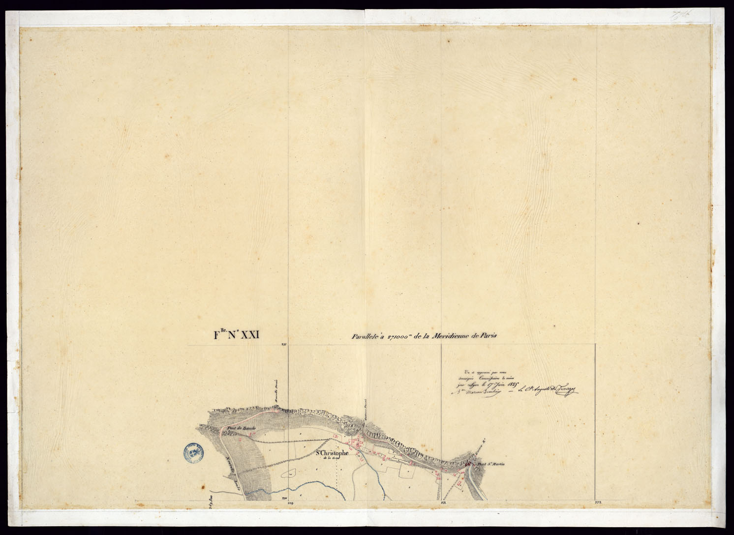 "Oltre il titolo indicato sul "Tableau d'assemblage" - Quadro d'unione - si leggono nei fogli distinti i titoli particolari: - Plan de nouvelles lignes laterales du Rhòne - Pour le Lieutenant Général commissaire du Roi pour la Demarcation des frontieres orientales du Royaume Le Colonel delegué pour la Demarcation des Limites avec les Etats de S.M. le Roy de Sardigne - Plan des nouvelles lignes laterales du Guiers . Disegno a penna su carta lucida, probabilmente copia di un disegno originale. La carta si compone di 21 fogli (dei quali i primi 4 in due parti) ed un quadro d'unione per cui complessivamente consta di 26 grandi fogli non totalmente riempiti. E' riprodotto il corso del Rodano da un punto a circa 2 km. a monte di Anglefort sino alla confluenza del Guiers ed il corso di quest'ultimo sino al Pont Saint Martin poco a monte di Les Echelles. Il disegno è in azzurro per le acque, in rosso per i fabbricati, le dighe, il confine e le misure di riferimento in nero per la rete stradale, il tratteggio orografico e le scritture. Il Quadro d'Unione alla scala di 1:100.000 porta in calce un elenco di 42 posizioni determinate per le loro coordinate rettangolari riferite alla meridiana ed alla perpendicolare di Parigi in base alle quali è tracciato il reticolato cassiniano della Carta. Documento interessante per la topografia storica dei fiumi rappresentati."