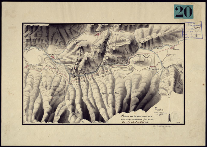"In basso a destra la scritta: Turin le 15 Avril 1818 Conti Joseph. Rappresenta alla scala 1:20000 solo la parte centrale del PLAN TOPOGRAPHIQUE a 1:20000 echelle metrique de la Position de LESSEILLON, qui comprend les Comunes environnantes de Villar Audin, Bourget, Aurieux, Auçois, Rossenches, Sardieres, Bramans, le Verney dans la Vallée de Maurienne levée en 1817 -"