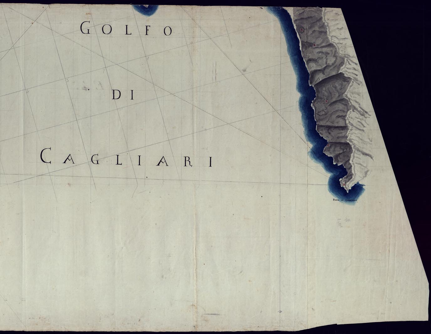 "Il titolo non è presente sulla carta. Carta corografica all'acquerello in quattro fogli di varia grandezza comprendente il territorio fra Cagliari ed Oristano. Strade disegnate in giallo, abitati in rosso, acque in bleu."