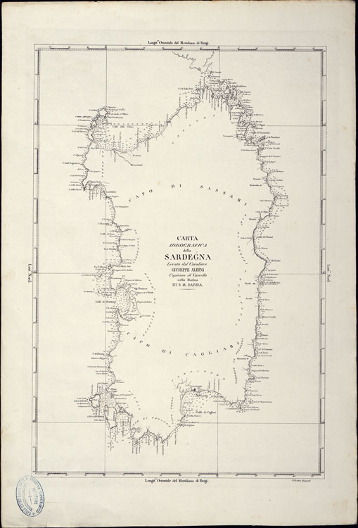 PORTOLANO DELLA SARDEGNA - CARTA IDROGRAFICA DELLA SARDEGNA LEVATA DAL CAVALIERE GIUSEPPE ALBINI CAPITANO DI VASCELLO NELLA MARINA DI S.M. SARDA - QUADRO D'INSIEME.