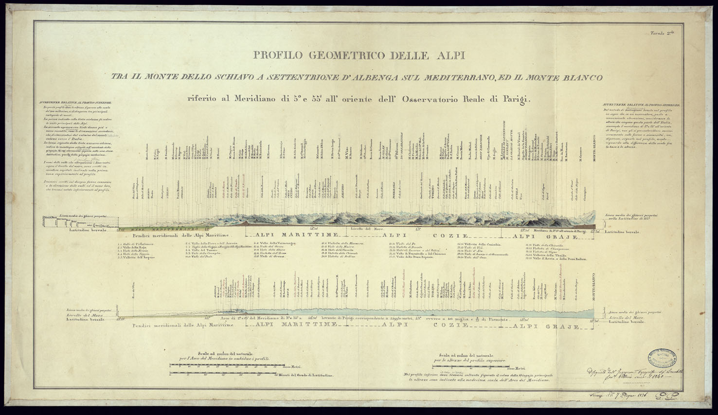 PROFILO GEOMETRICO DELLE ALPI TRA IL MONTE SCHIAVO A SETTEMTRIONE D'ALBENGA SUL MEDITERRANEO, ED IL MONTE BIANCO RIFERITO AL MERIDIANO DI 5° E 55' DELL'OSSERVATORIO REALE DI PARIGI - TAVOLA 2