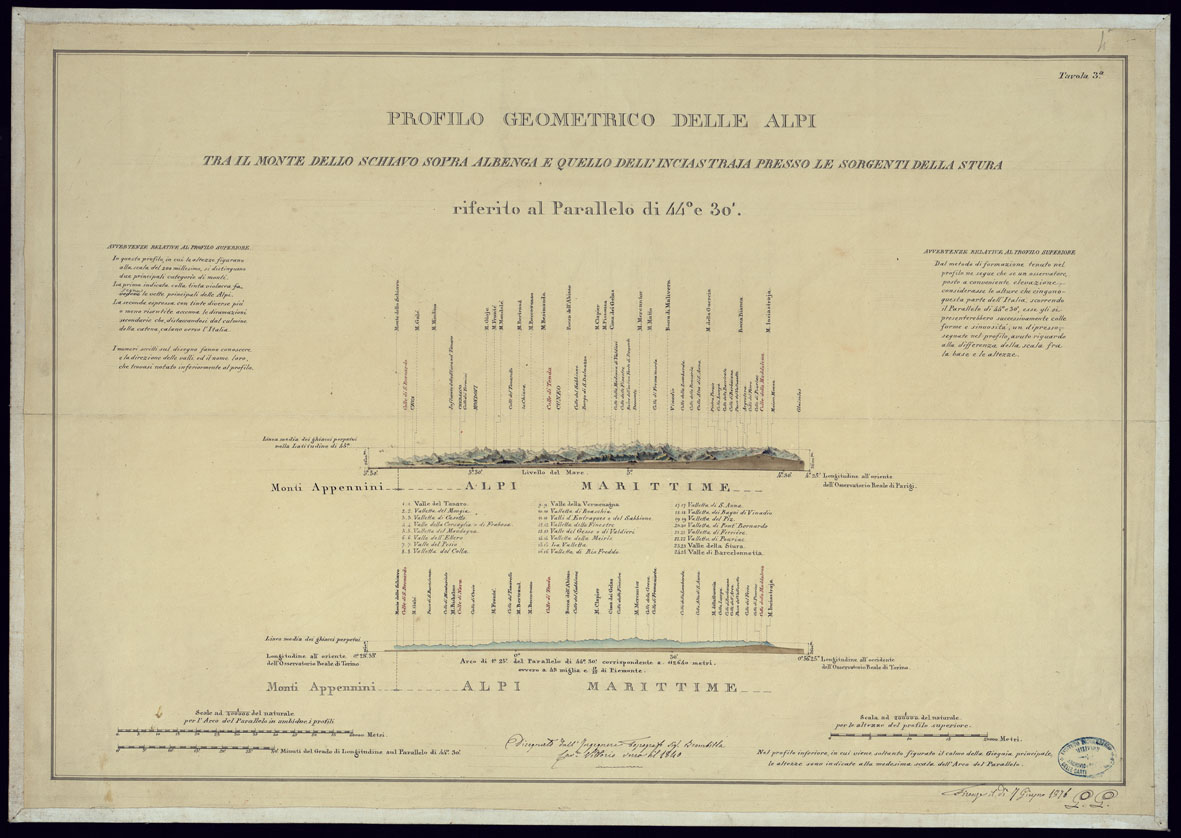 "Tre tavole rappresentanti il tratto compreso "tra il Monte Bianco e la cima di Bittoray all'oriente del Golfo di Quarnero riferito al parallelo di 45° e 25'" la seconda sezione "tra il Monte dello Schiavo a settembre di Albenga sul Mediterraneo ed il Monte Bianco, riferita al meridiano di 5° e 55' all'oriente dell'Osservatorio Reale di Parigi". La terza sezione "tra il Monte dello Schiavo sopra Albenga e quello dell'Enciastra" presso le sorgenti della Stura, riferita al parallelo di 44° e 30'. Torino nel 1845, per cura del Quartier Mastro Generale dell'Esercito Sardo ANNIBALE SALUZZO."