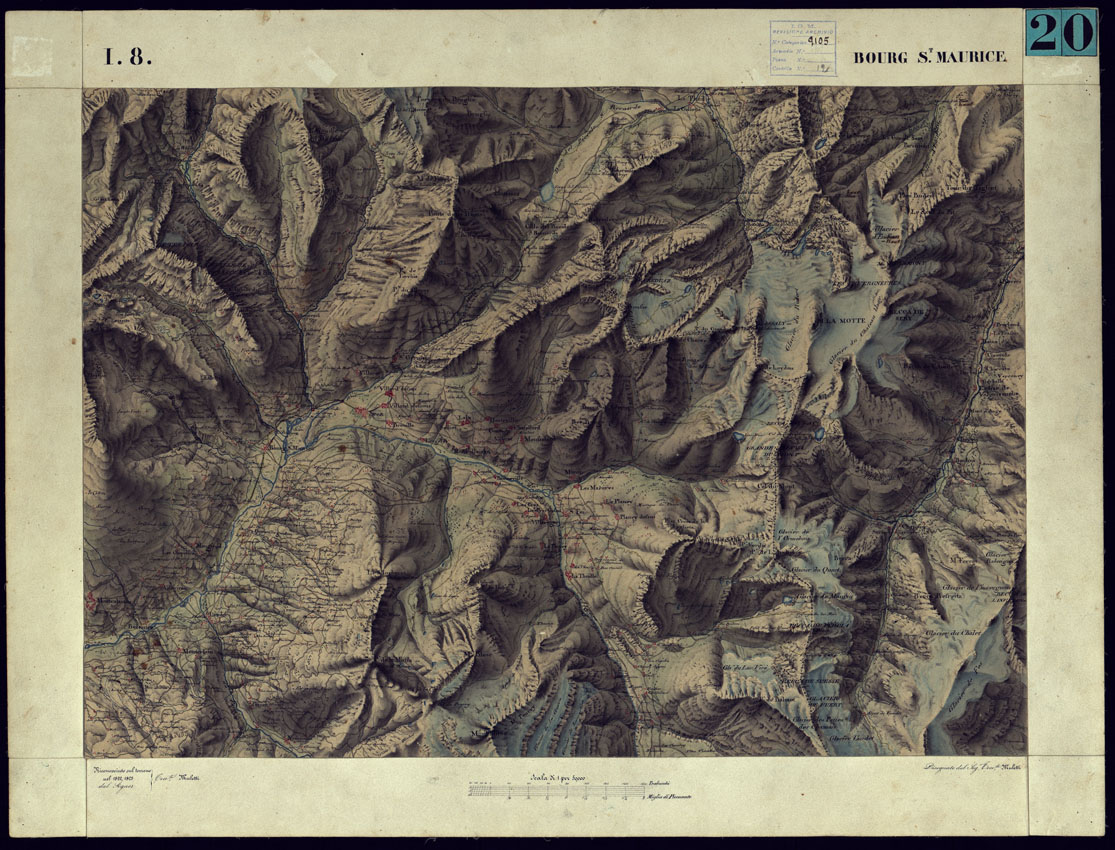 CARTA TOPOGRAFICA DEGLI STATI DI TERRA FERMA DI S.S.R.M. CARLO ALBERTO RE DI SARDEGNA FATTA DAL CORPO DELLO STATO MAGGIORE COMANDATO DAL TEN.TE GEN.LE B.NE DI MONTHOUX ALLA SCALA DI 1 50.000 1831 - FOGLIO I.8 BOURG. S. MAURICE.