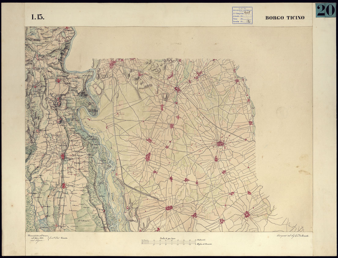 CARTA TOPOGRAFICA DEGLI STATI DI TERRA FERMA DI S.S.R.M. CARLO ALBERTO RE DI SARDEGNA FATTA DAL CORPO DELLO STATO MAGGIORE COMANDATO DAL TEN.TE GEN.LE B.NE DI MONTHOUX ALLA SCALA DI 1 50.000 1831 - FOGLIO I.13 BORGO TICINO.