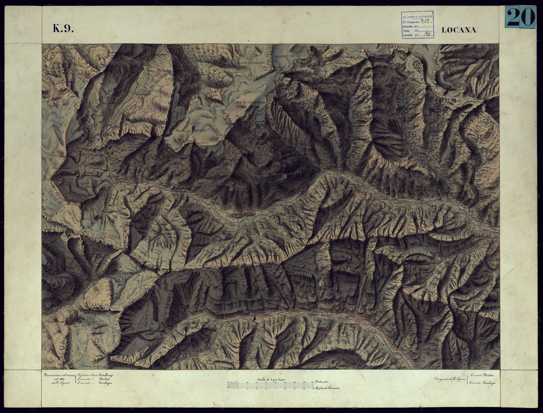 CARTA TOPOGRAFICA DEGLI STATI DI TERRA FERMA DI S.S.R.M. CARLO ALBERTO RE DI SARDEGNA FATTA DAL CORPO DELLO STATO MAGGIORE COMANDATO DAL TEN.TE GEN.LE B.NE DI MONTHOUX ALLA SCALA DI 1 50.000 1831 - FOGLIO K.9 LOCANA.