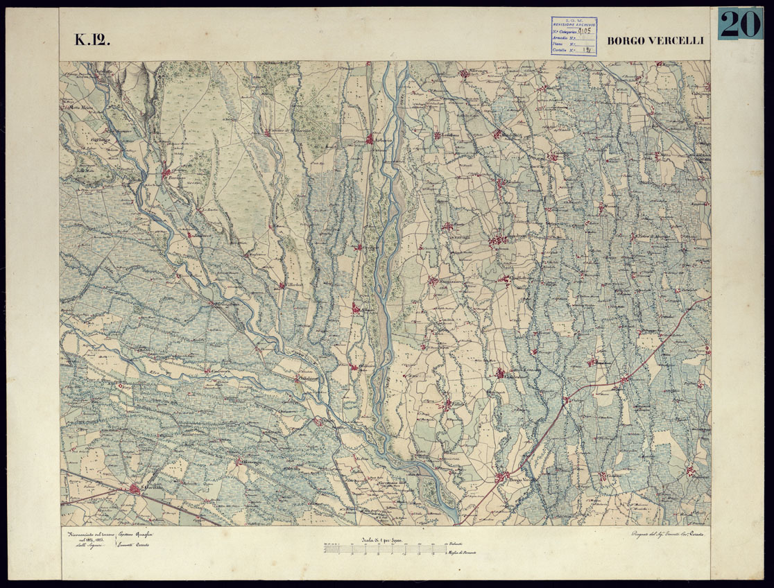 CARTA TOPOGRAFICA DEGLI STATI DI TERRA FERMA DI S.S.R.M. CARLO ALBERTO RE DI SARDEGNA FATTA DAL CORPO DELLO STATO MAGGIORE COMANDATO DAL TEN.TE GEN.LE B.NE DI MONTHOUX ALLA SCALA DI 1 50.000 1831 - FOGLIO K.12 BORGO VERCELLI.