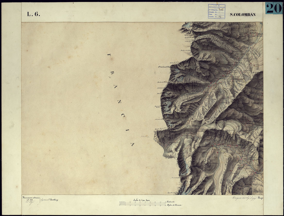 CARTA TOPOGRAFICA DEGLI STATI DI TERRA FERMA DI S.S.R.M. CARLO ALBERTO RE DI SARDEGNA FATTA DAL CORPO DELLO STATO MAGGIORE COMANDATO DAL TEN.TE GEN.LE B.NE DI MONTHOUX ALLA SCALA DI 1 50.000 1831 - FOGLIO L.6 S. COLOMBAN.