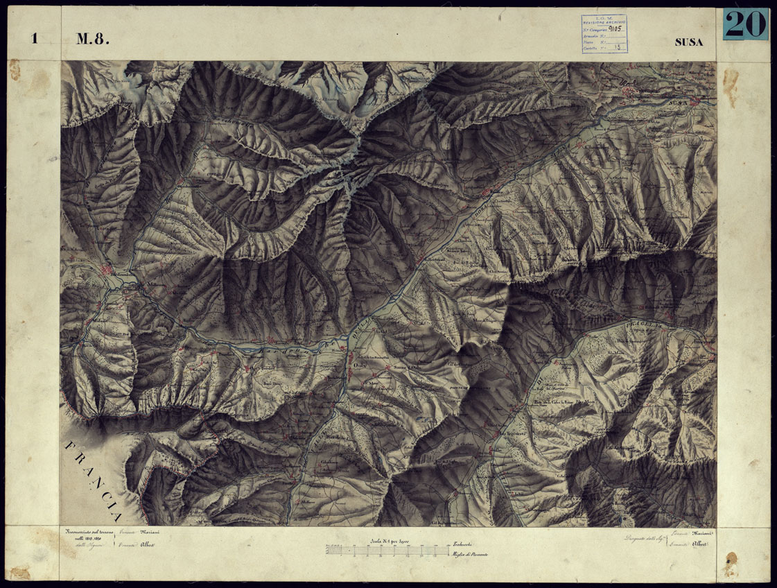 CARTA TOPOGRAFICA DEGLI STATI DI TERRA FERMA DI S.S.R.M. CARLO ALBERTO RE DI SARDEGNA FATTA DAL CORPO DELLO STATO MAGGIORE COMANDATO DAL TEN.TE GEN.LE B.NE DI MONTHOUX ALLA SCALA DI 1 50.000 1831 - FOGLIO M.8 SUSA.