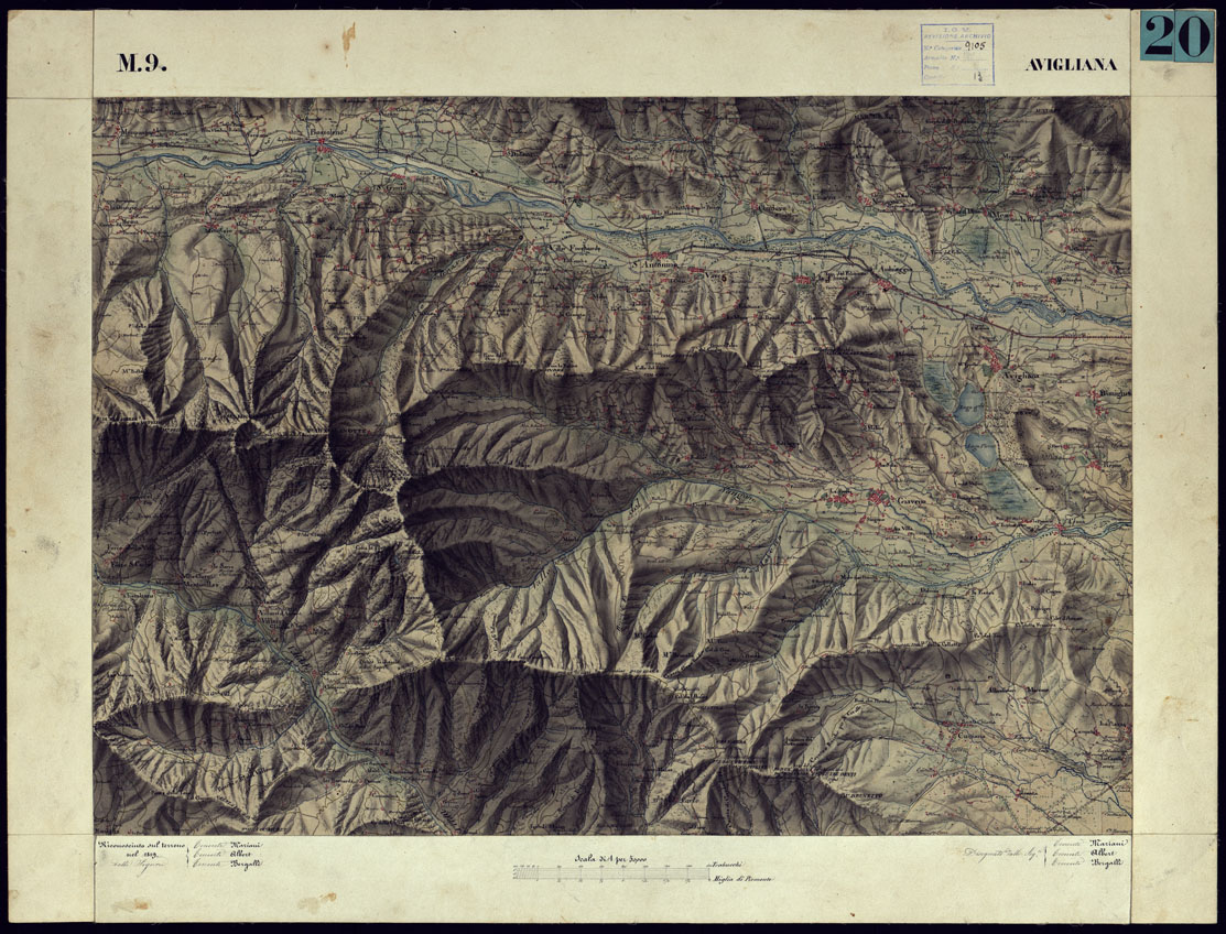 CARTA TOPOGRAFICA DEGLI STATI DI TERRA FERMA DI S.S.R.M. CARLO ALBERTO RE DI SARDEGNA FATTA DAL CORPO DELLO STATO MAGGIORE COMANDATO DAL TEN.TE GEN.LE B.NE DI MONTHOUX ALLA SCALA DI 1 50.000 1831 - FOGLIO M.9 AVIGLIANA.