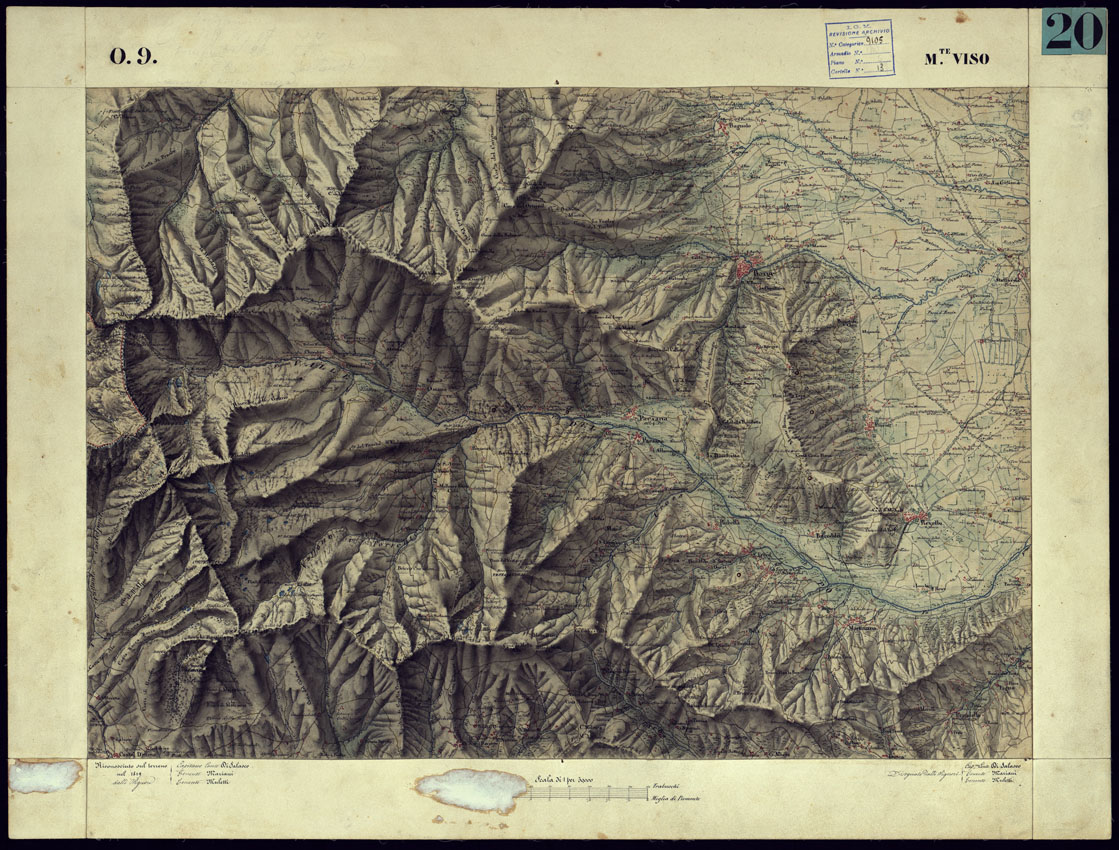 CARTA TOPOGRAFICA DEGLI STATI DI TERRA FERMA DI S.S.R.M. CARLO ALBERTO RE DI SARDEGNA FATTA DAL CORPO DELLO STATO MAGGIORE COMANDATO DAL TEN.TE GEN.LE B.NE DI MONTHOUX ALLA SCALA DI 1 50.000 1831 - FOGLIO O.9 M. VISO.