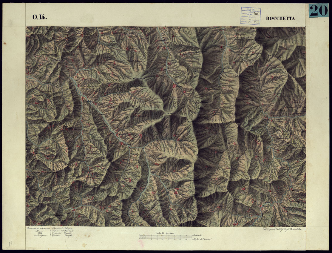 CARTA TOPOGRAFICA DEGLI STATI DI TERRA FERMA DI S.S.R.M. CARLO ALBERTO RE DI SARDEGNA FATTA DAL CORPO DELLO STATO MAGGIORE COMANDATO DAL TEN.TE GEN.LE B.NE DI MONTHOUX ALLA SCALA DI 1 50.000 1831 - FOGLIO O.14 ROCCHETTA.