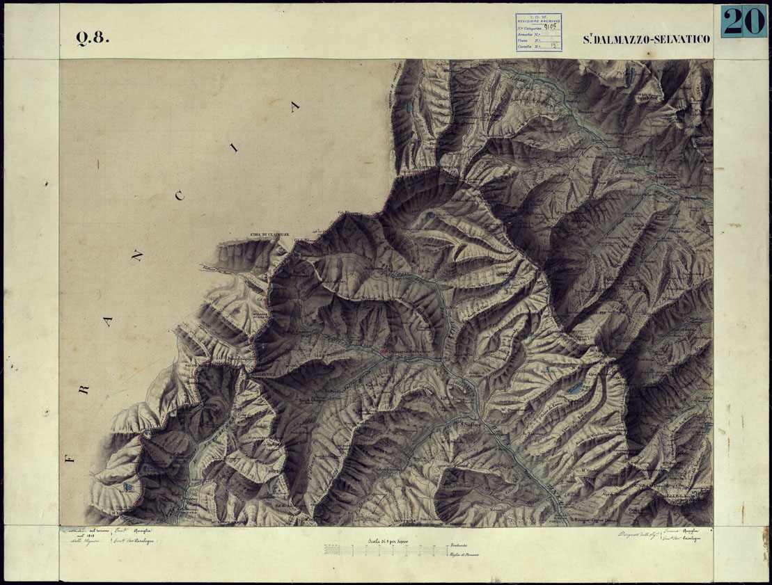 CARTA TOPOGRAFICA DEGLI STATI DI TERRA FERMA DI S.S.R.M. CARLO ALBERTO RE DI SARDEGNA FATTA DAL CORPO DELLO STATO MAGGIORE COMANDATO DAL TEN.TE GEN.LE B.NE DI MONTHOUX ALLA SCALA DI 1 50.000 1831 - FOGLIO Q.8 S. DALMAZZO-SELVATICO.