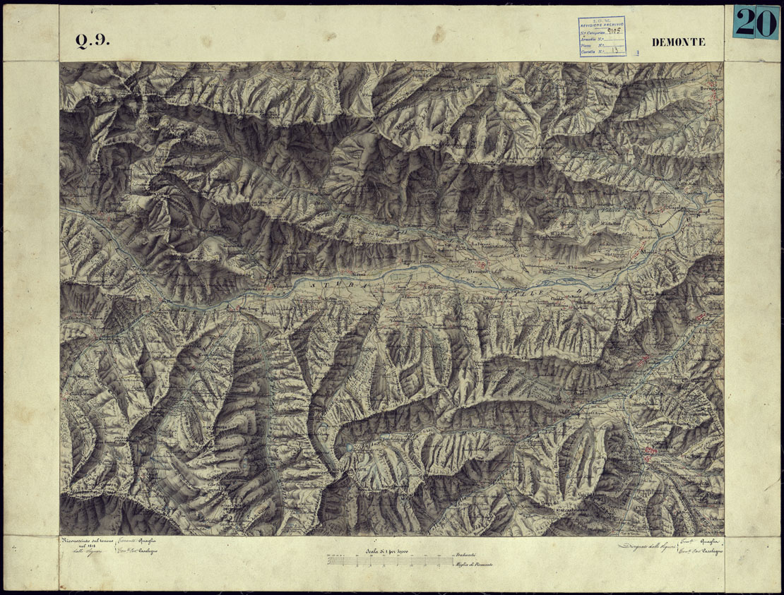 CARTA TOPOGRAFICA DEGLI STATI DI TERRA FERMA DI S.S.R.M. CARLO ALBERTO RE DI SARDEGNA FATTA DAL CORPO DELLO STATO MAGGIORE COMANDATO DAL TEN.TE GEN.LE B.NE DI MONTHOUX ALLA SCALA DI 1 50.000 1831 - FOGLIO Q.9 DEMONTE.