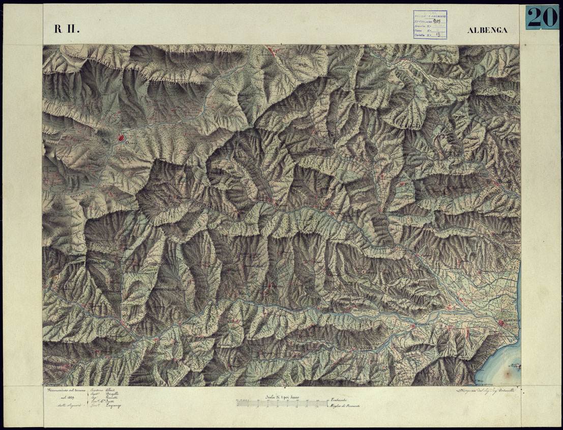 CARTA TOPOGRAFICA DEGLI STATI DI TERRA FERMA DI S.S.R.M. CARLO ALBERTO RE DI SARDEGNA FATTA DAL CORPO DELLO STATO MAGGIORE COMANDATO DAL TEN.TE GEN.LE B.NE DI MONTHOUX ALLA SCALA DI 1 50.000 1831 - FOGLIO R.11 ALBENGA.