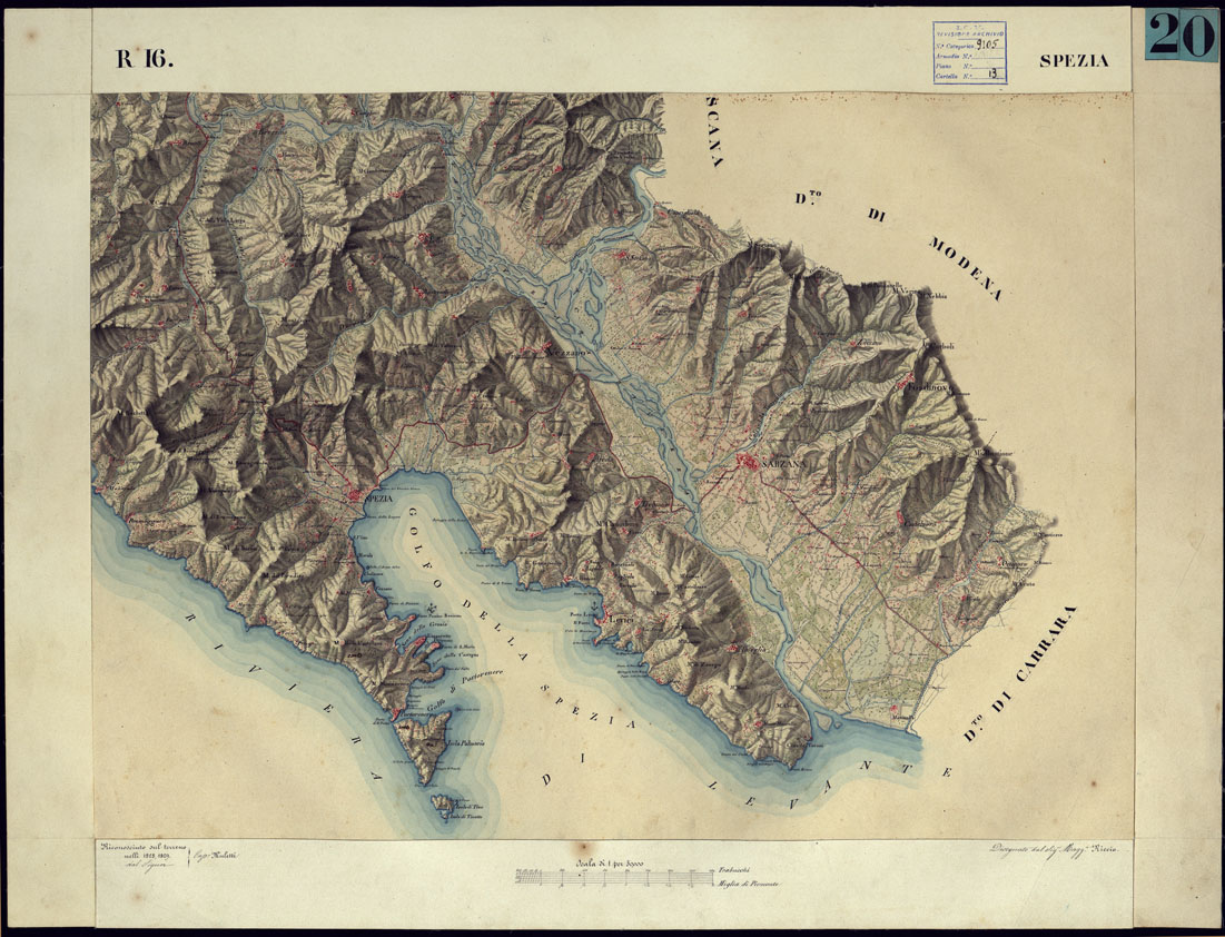CARTA TOPOGRAFICA DEGLI STATI DI TERRA FERMA DI S.S.R.M. CARLO ALBERTO RE DI SARDEGNA FATTA DAL CORPO DELLO STATO MAGGIORE COMANDATO DAL TEN.TE GEN.LE B.NE DI MONTHOUX ALLA SCALA DI 1 50.000 1831 - FOGLIO R.16 LA SPEZIA.