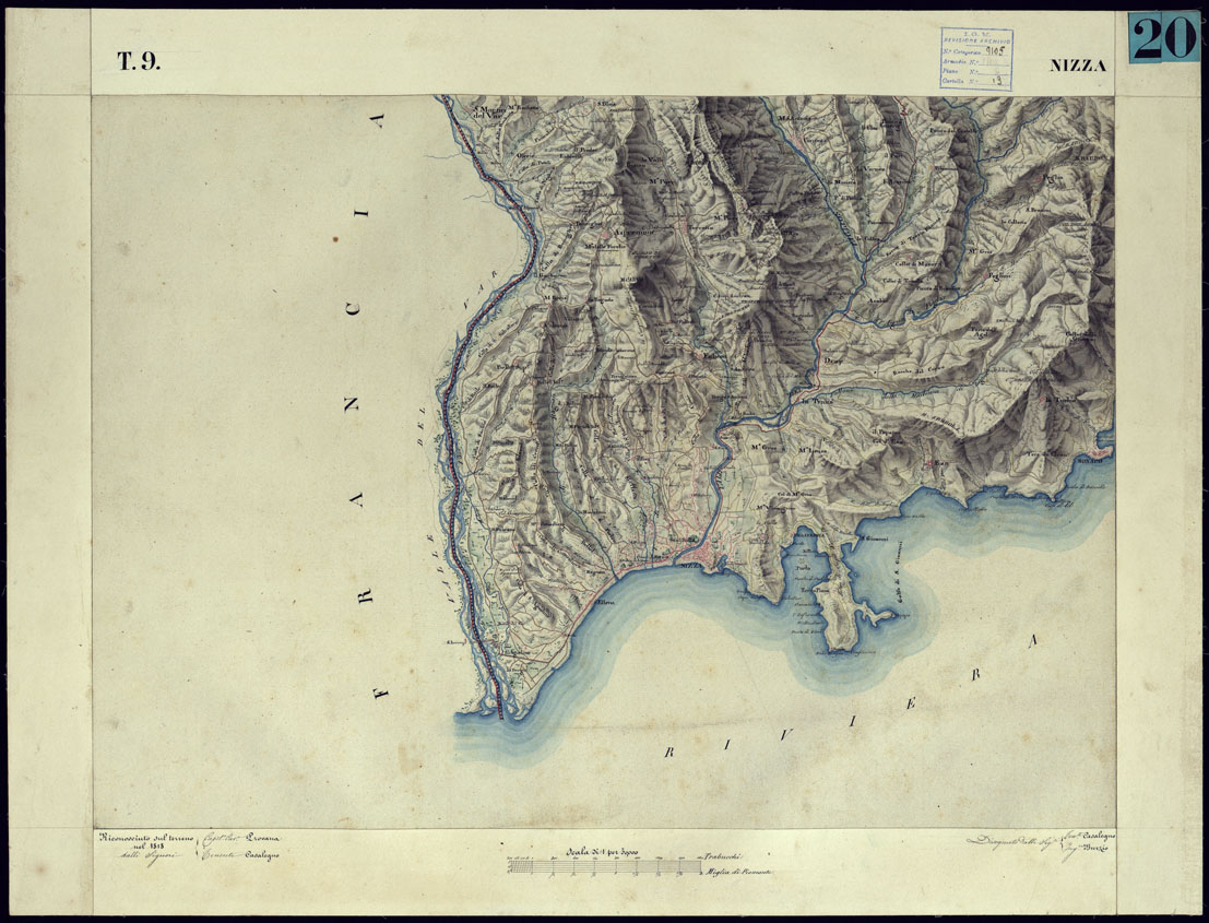 CARTA TOPOGRAFICA DEGLI STATI DI TERRA FERMA DI S.S.R.M. CARLO ALBERTO RE DI SARDEGNA FATTA DAL CORPO DELLO STATO MAGGIORE COMANDATO DAL TEN.TE GEN.LE B.NE DI MONTHOUX ALLA SCALA DI 1 50.000 1831 - FOGLIO T.9 NIZZA.