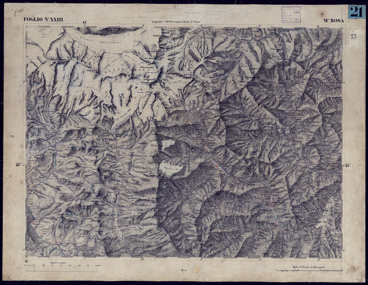 CARTA TOPOGRAFICA DEGLI STATI IN TERRAFERMA DI S.M. IL RE DI SARDEGNA ALLA SCALA DI 1 A 50.000 OPERA DEL CORPO REALE DELLO STATO MAGGIORE - FOGLIO N° XXIII M. ROSA