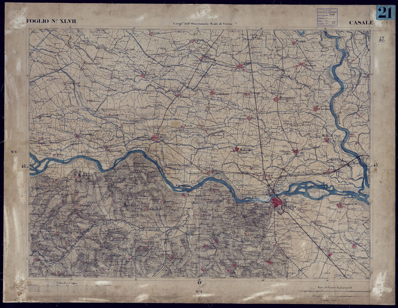 CARTA TOPOGRAFICA DEGLI STATI IN TERRAFERMA DI S.M. IL RE DI SARDEGNA ALLA SCALA DI 1 A 50.000 OPERA DEL CORPO REALE DELLO STATO MAGGIORE - FOGLIO N°XLVII CASALE