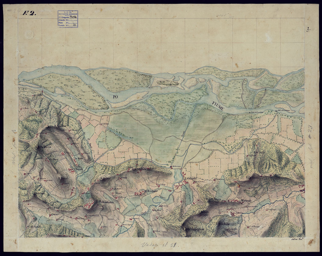 "Il titolo non è presente sulla carta. La carta consta di 24 fogli. I primi quattro fogli provengono da ridisegni mentre gli altri venti sono rilievi originali di campagna e sono in parte costituiti da spezzoni riuniti. Orografia acquerellata a luce obliqua. Qualche foglio reca la firma dei tenenti Salius, Ricci e Morozzo."