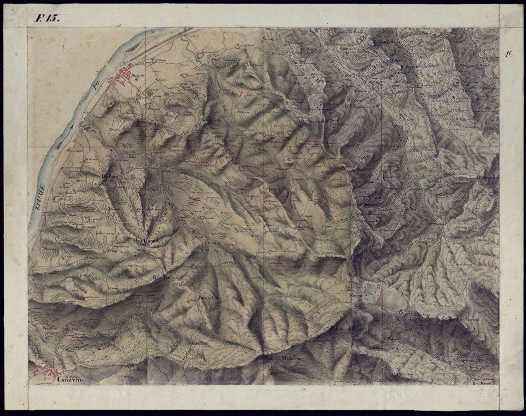 "Il titolo non è presente sulla carta. La carta consta di 24 fogli. I primi quattro fogli provengono da ridisegni mentre gli altri venti sono rilievi originali di campagna e sono in parte costituiti da spezzoni riuniti. Orografia acquerellata a luce obliqua. Qualche foglio reca la firma dei tenenti Salius, Ricci e Morozzo."