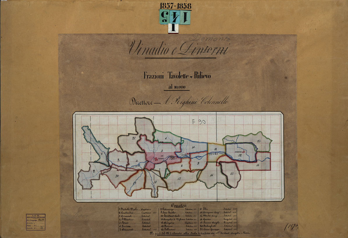 VINADIO E DINTORNI FRAZIONI E TAVOLETTE RILIEVO AL 10.000 DIRETTORE A. RIGHINI COLONELLO - QUADRO D'UNIONE.