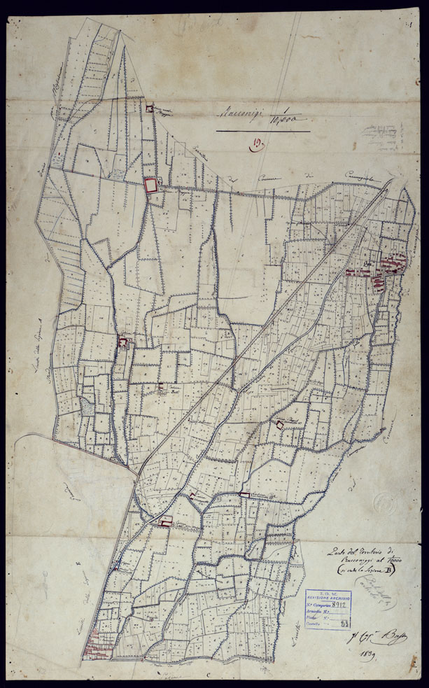 "Il titolo non è presente sulla carta. Gruppo di 16 mappe catstali riconosciute sul terreno probabilmente per la costruzione della carta generale degli Stati Sardi al 50.000. Alcune di esse recano le firme dei Cap.i Basso Lafleche e del geometra Coda."