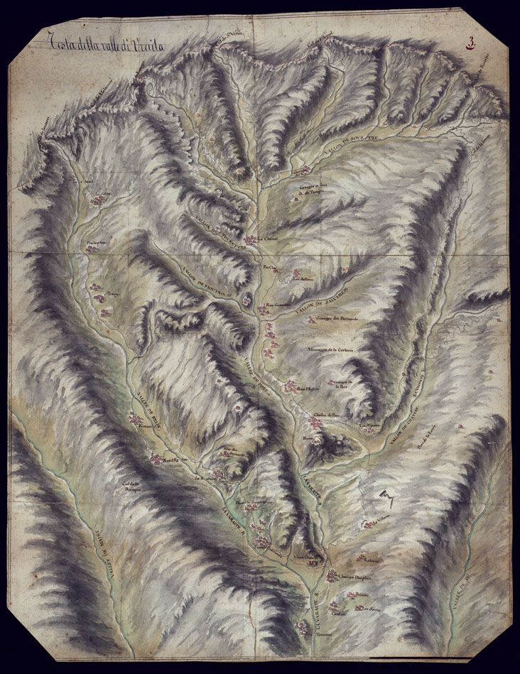 "Disegno ad acquerello in foglio unico montato su tela grossa. Orografia a sfumo semiprospettica, abitati rappresentati prospetticamente con casine in rosso acque in azzurro."