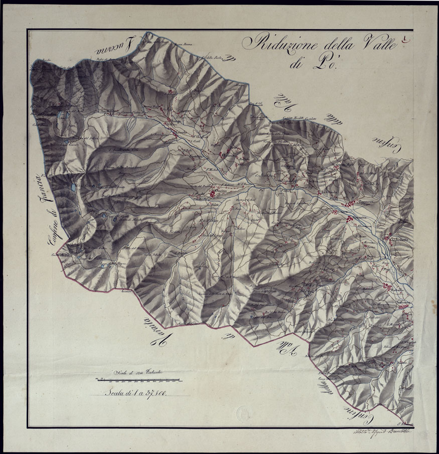 "Disegno ad acquerello che rappresenta l'alta Valle del Po dalle sorgenti a Sanfronte, attribuito al Brambilla. Orografia rappresentata con lo sfumo a luce obliqua, abitati in rosso, acque in azzurro. Scala grafica in trabucchi."