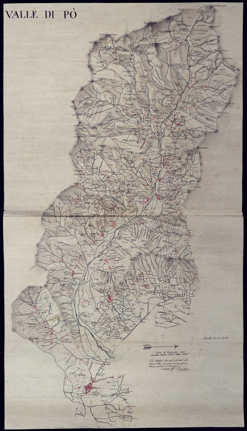 "In basso è scritto " J'ai collationé cette carte de la Vallée de po depuis Saluce jusqu'aux sources et jé l'ai trouvée conforme à l'original. Lascaris, off. d'Inspection". L'esemplare è una copia ridotta del documento N. 203."