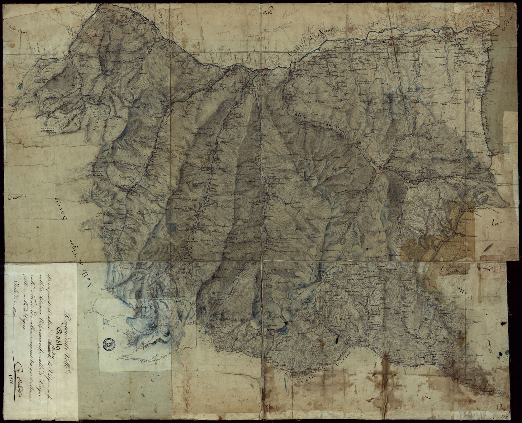 "Un foglio composto di minute di campagna unite a mosaico, dei rilevamenti eseguiti 1820. Firma supposta originale di F. Muletti. Orografia a tratteggio, abitati in rosso, acque in azzurro. Annesso un fascicolo manoscritto contenente un "catalogo di nomi" e una piantina di Aosta al 10.000."