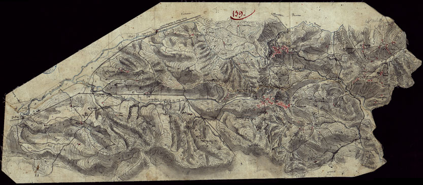 "Gruppo di 142 minute di campagna, e un quadro d'unione, in fogli irregolari, alcuni con degli spezzoni allegati, montati su tela. L'orografia vi è rappresentata variamente talvolta con curve dimostrative e tratteggio, oppure con sfumo a luce obliqua e tratteggio o con sfumo e curve dimostrative. Gli abitati sono colorati in rosso le acque in azzurro. Le minute sono firmate dagli Ufficiali del Corpo di Stato Maggiore: Albet, Bergalli, Casalegno, Castelborgo, Castellengo, Cossato, Gianotti, Mariani, Morozzo, Muletti, Pellegrini, D'Angennes, La Grange, La Marmora, Roberti, Scoti, che eseguirono le ricognizioni negli anni 1827-29."