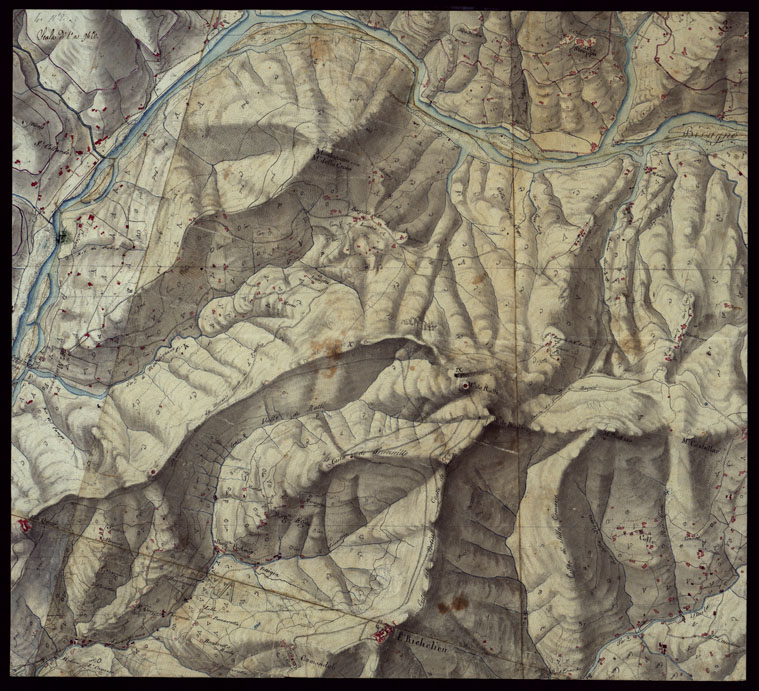 "Il titolo non è presente sulla carta. Cinque fogli disegnati ad acquerello a luce obliqua, uniti a mosaico, senza data nè firma. Nel documento sono presenti due fogli diversi ma entrambi segnati come n. 4. Si presume che fossero vecchi rilievi utilizzati forse per la carta del Piemonte al 50. 000."